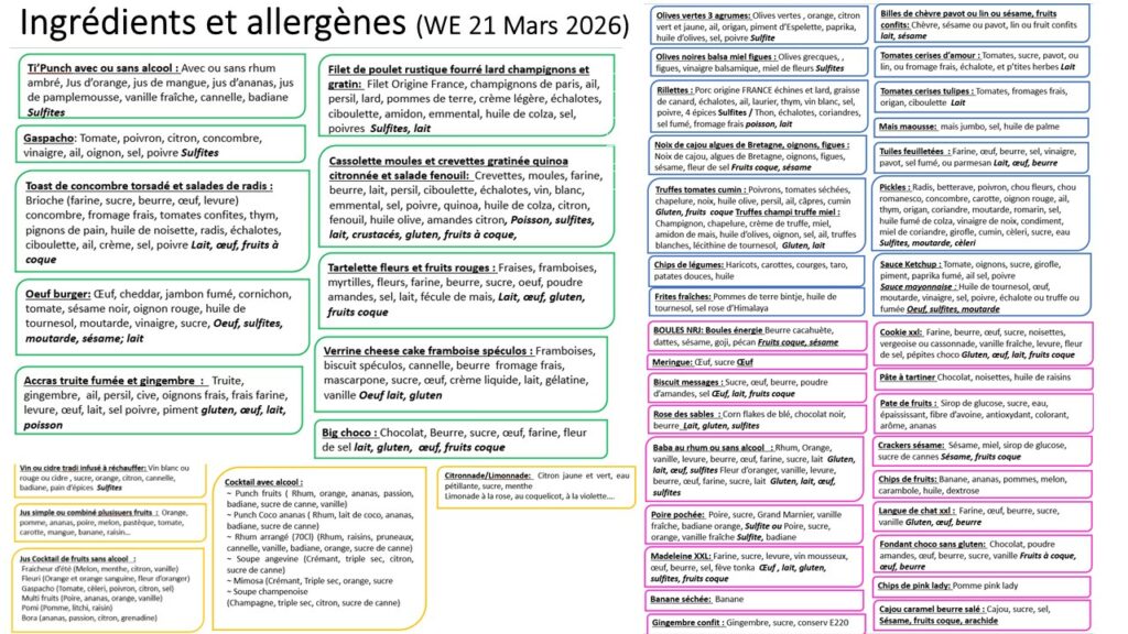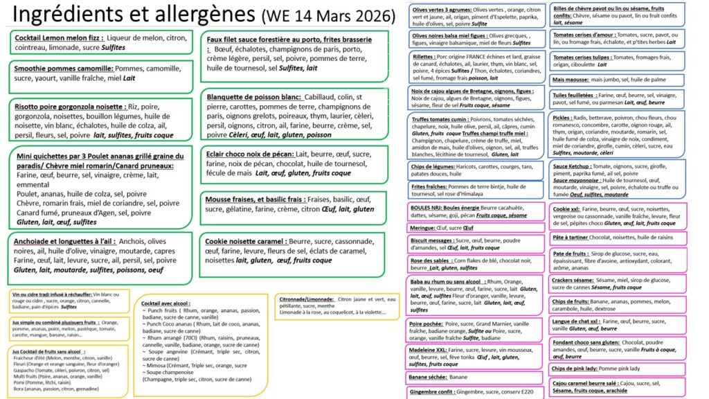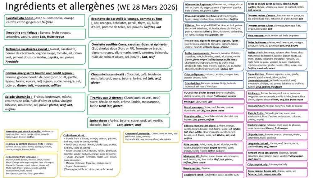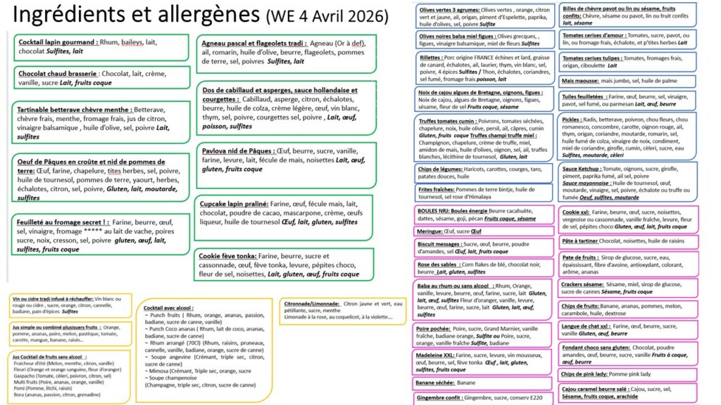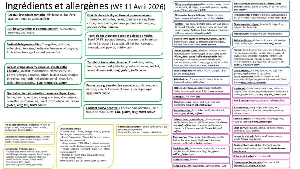 Retrouvez ci-après les fiches produits qui précisent la liste des ingrédients par plat ainsi que les allergènes